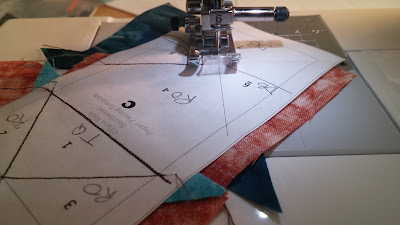 There are many ways to foundation paper piece, but for me, I first learned to paper piece scrappy style. There are no set cutting directions, if it fits, I sew. It works fine and dandy scrappy style, but once I have a pattern with certain size pieces that must line up, I need to have some sort of method. There are a few paper piecing patterns out there that have set cut directions, but I wanted to show you how to make do with the many patterns that don't have cutting directions.